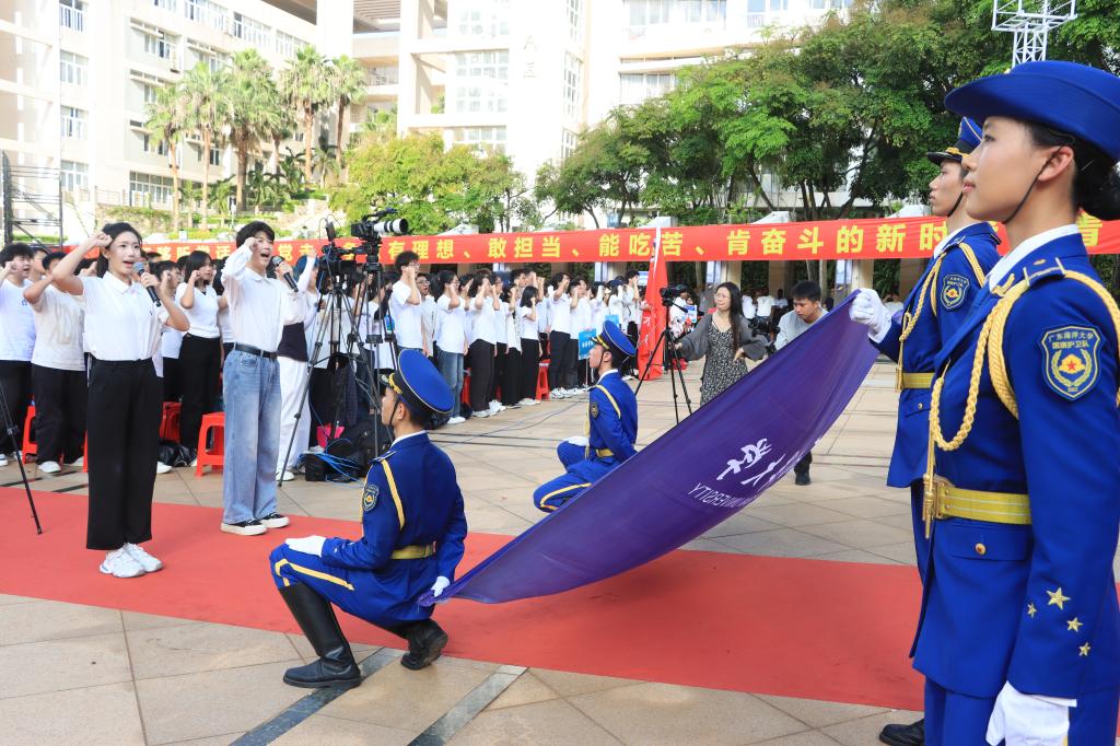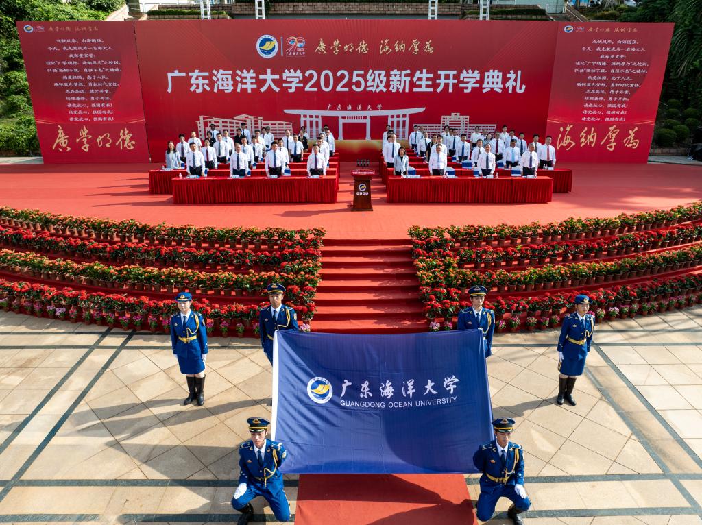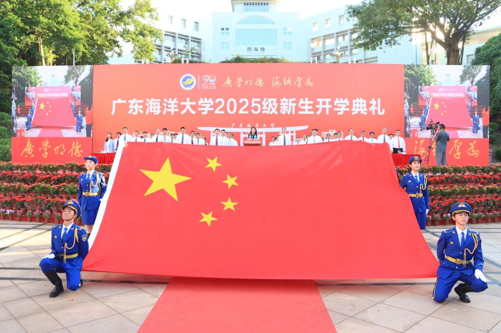 典礼上,一场庄重而又富有深意的仪式让全场师生心潮澎湃。伴随着铿锵有力的步伐,国旗护卫队护送一面具有独一无二编号的五星红旗庄严入场——这面于2025年6月8日“世界海洋日暨全国海洋宣传日”在天安门广场冉冉升起的国旗,跨越千山万水从首都北京来到南海之滨湛江。不仅承载着中华民族伟大复兴的海洋强国梦,更镌刻着学校建设发展的里程碑意义。