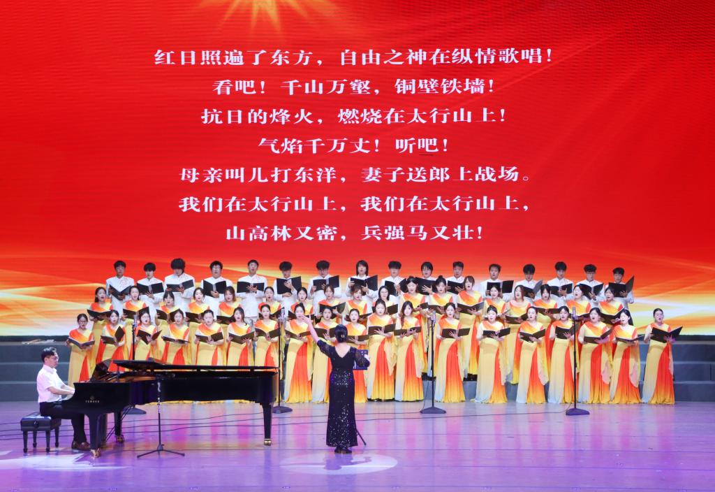 杨洲以“九一八”事变94周年为切入点,讲述了中华民族14年抗战的艰苦历程和伟大胜利的历史意义,并逐一深入讲解了《旗正飘飘》《在太行山上》《保卫黄河》《没有共产党就没有新中国》《在希望的田野上》等五首歌的创作背景、历史价值和时代意义,他引经据典,掷地有声,生动呈现了一部波澜壮阔的民族奋斗史。从国难当头时中华儿女浴血奋战的悲壮,到中国共产党领导的八路军在太行山上筑起钢铁长城,再到全民族抗战发出震天动地的怒吼,直至揭示出中国共产党是历史与人民的必然选择,从革命的战火硝烟到和平建设的伟大征程,每一个音符都饱含着深情,每一个故事都震撼人心。钢琴伴奏铿锵有力,合唱气势恢宏,现场掌声不断,气氛热烈。