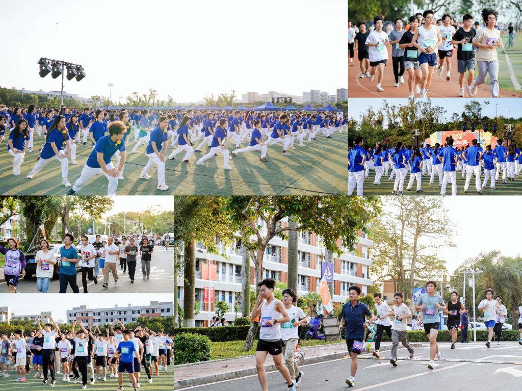 现场人声鼎沸,暖场音乐奏响,气氛瞬间点燃。在领操员的规范指导下,选手们充分活动关节、舒展身体,以饱满的精神状态完成热身准备。热身结束,杨洲为活动鸣枪发令后,参加活动师生如离弦之箭冲出起跑线,沿着精心设计的环校路线奋力奔跑。校园跑以西区运动场为起点,串联校园经典地标后折返。大家并肩前行,相互激励,用脚步丈量校园,以汗水诠释坚持。沿途补给站和医疗点为师生提供坚实保障。