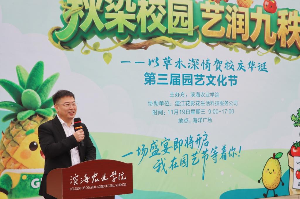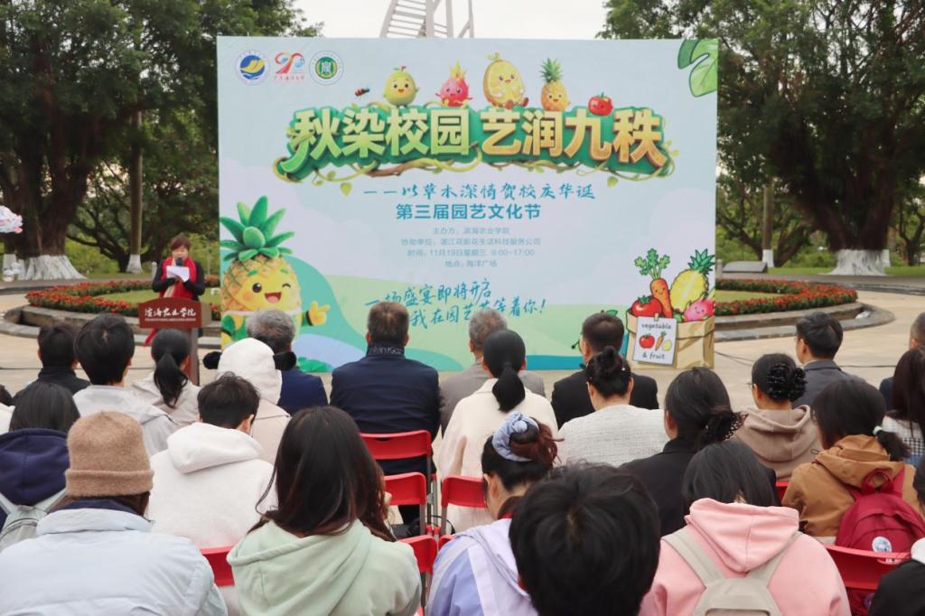11月19日,学校第三届园艺文化节在湖光校区海洋广场举行。校党委书记杨洲,湛江市科协原主席、校友肖斌,湛江花影花生活科技服务公司董事长、校友何敏桢,滨海农业学院领导班子及园艺系师生参加活动,开幕式由滨海农业学院党委副书记王继全主持。本届文化节以“秋染校园,艺润九秩”为主题,是一场融合了科技、艺术与生活的园艺盛会。