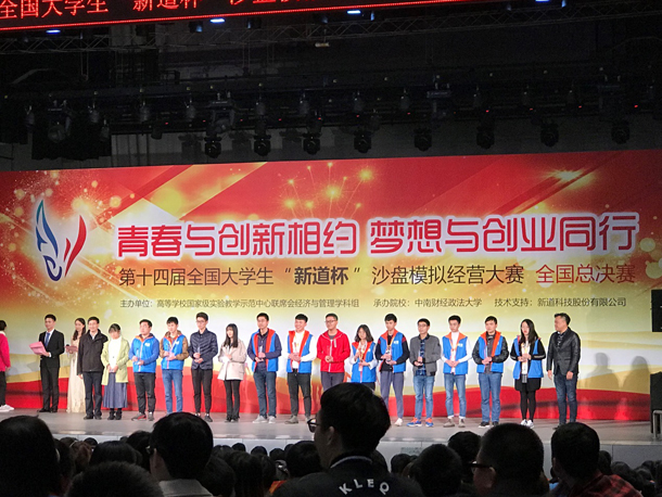 11 月 9 日至 11 日,由高等学校国家级实验教学示范中心联席会经济与管理学科组主办、中南财经政法大学承办、新道科技股份有限公司提供技术支持的第十四届全国大学生“新道杯”沙盘模拟经营大赛全国总决赛在中南财经政法大学隆重举行。本次大赛共有来自全国各地本科院校的 130 支队伍参赛,其中参赛院校 127 所,参赛人数达650余人。金年会代表队由管理学院2016级本科生王凌鑫、林淙铉、黄浩城、谭丽婷、刘泽华五名同学组成,代表队在校团委、学院领导的大力支持和指导老师孟飞荣的指导下,在省赛中获得了一等奖,成功晋级此次全国总决赛,并取得了国赛二等奖的好成绩。