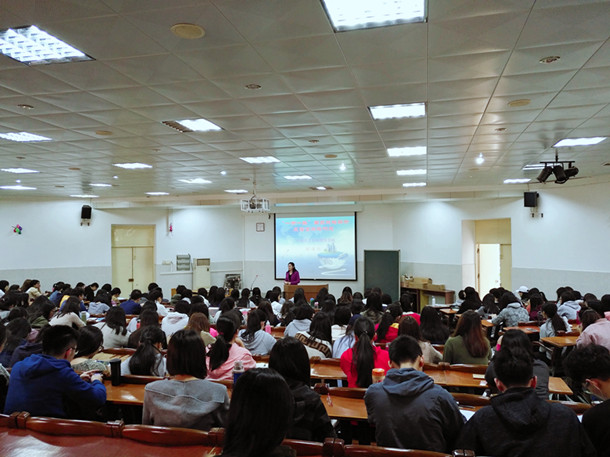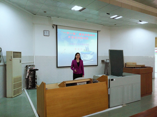 3月15日下午,外国语学院院长郭遂红在兴教楼110为学生讲授思想政治理论课,主讲题目为:《“一带一路”国家战略解读及语言战略构建》, 外国语学院2015级学生、学院党员发展对象等到场聆听了讲课。