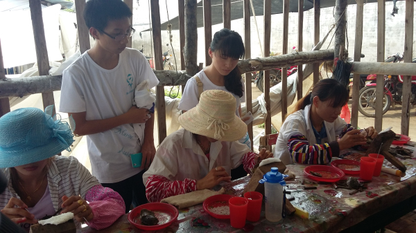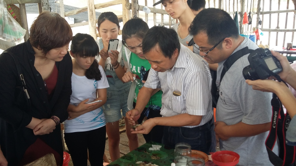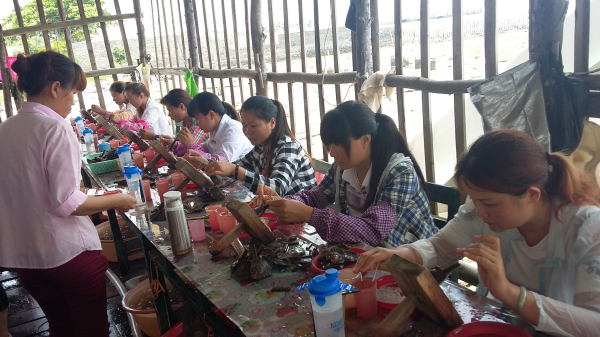 珍珠养殖场坐落在美丽的南海岸边,大家饶有兴趣地参观了养殖场以及周边的自然和人文环境。在养殖场内的珍珠插核作业间,工人们在紧张有序的忙碌着。黄高工为大家详细讲解了珍珠贝的插核工作流程和珍珠形成原理,大家全神贯注地听黄高工的讲解,不时提出一些问题,黄高工一一为大家解答。李主任向大家介绍了珍珠贝苗的孵化与培育、珍珠贝生长对环境的要求以及珍珠产品的市场发展趋势。随后,大家和李主任、黄高工进行了深入的交流和探讨。