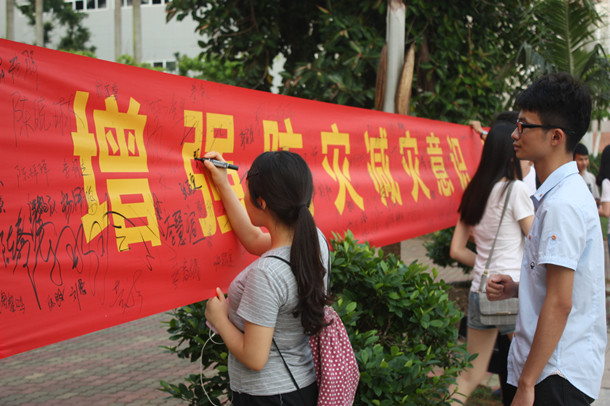 本次校园防灾减灾宣传教育活动以“加强防灾减灾工作,构建平安和谐校园”为主题,以“横幅签名”和“图片展览”两种形式向广大学生宣传普及防灾减灾相关知识,全校500余名学生参与现场活动。