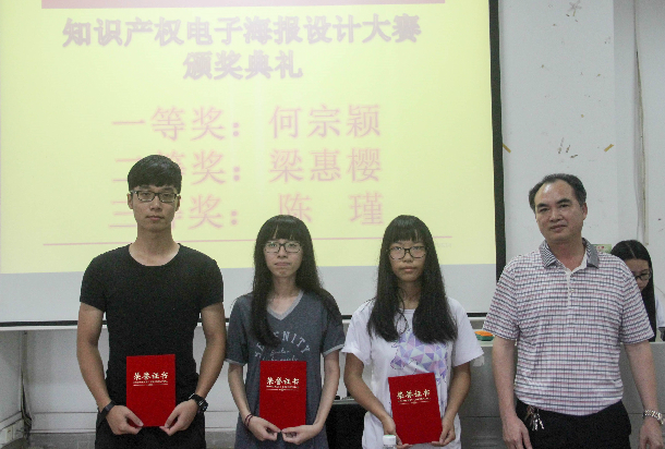 “普法之星”大赛活动完成后,对知识产权宣传电子海报设计大赛获奖者进行颁奖。本次知识产权电子海报设计大赛,共收集来自全校各专业学生作品131件,经过组织专家评比,共评出6份优秀的作品获奖,其中一、二、三等奖各1项,优秀奖3项。