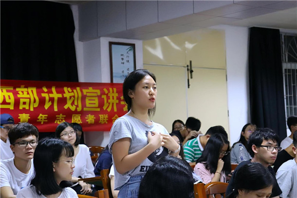 观看完西部计划宣传视频后,谢炜珊、牟桃、肖阳三位志愿者分别从不同角度,讲述了各自在西部参与志愿服务的经历。省项目办刘淑贤老师为在场的同学们介绍了西部计划的实施情况,详细讲解西部计划志愿者的工作内容、报名事项、招募流程、后勤保障以及相关优惠政策。她希望金年会能有更多的人参加西部计划,在祖国最需要的地方建功立业。