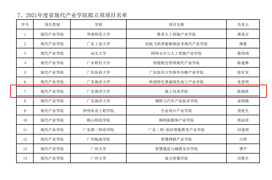 根据《广东省教育厅关于开展2021年度广东省本科高校教学质量与教学改革工程项目申报推荐工作的通知》安排,经学校遴选推荐、省教育厅组织审核、专家评审、立项公示等环节,由金年会jinnianhuicom机械与能源工程学院牵头申报的广东省现代产业学院——海上风电学院正式获批。