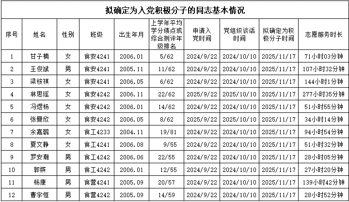 根据《金年会jinnianhuicom发展党员工作细则》(广海大党〔2021〕191号)规定,经本人提出申请,团组织推优,在听取培养联系人、党员和群众意见的基础上,根据最近一学年平均学分绩点或综合测评年级专业排名不超过40%,志愿服务时长20小时以上(含20小时),遵守国家法律法规及校规校纪,同等条件下,优先考虑将学生干部或获得突出奖项、有突出贡献者确定为入党积极分子等标准,经食品科学与工程学院学生党支部集体讨论研究决定,拟将甘子楠等12名同志确定为入党积极分子。现将其有关情况予以公示,征求党员、群众意见。