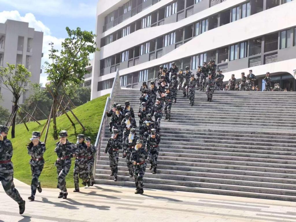 接下来的14天,在承训部队教官的严格指导与耐心带教下,一场场紧张有序的训练在训练场铺展开来。这不仅是军事技能的锤炼,更是意志与担当的磨砺。从晨光熹微时的站军姿开始,到正午烈日下的方阵训练,再到暮色中的战术演练,每个动作都力求标准,无论多么辛苦也没人喊放弃。九月的广东天气无常,烈日常把迷彩服浸出层层盐渍,骤雨又会瞬间浇透衣背,学子们抹一把脸上的水——分不清是汗水还是雨水,依然咬牙跟上训练节奏。更难忘台风过境前夕,狂风卷着乌云压向操场,教官临时调整训练方案,学子们挤在雨棚下,反复揣摩队列动作要领。承训教官看着浑身湿透却眼神发亮的学子,忍不住感慨“这股韧劲,不输军人!”正是这样的坚持,让5营学子一步步掌握了站军姿、走方阵、战术演练等各项军事技能,也让“坚韧不拔”成了这段时光最鲜明的注脚。