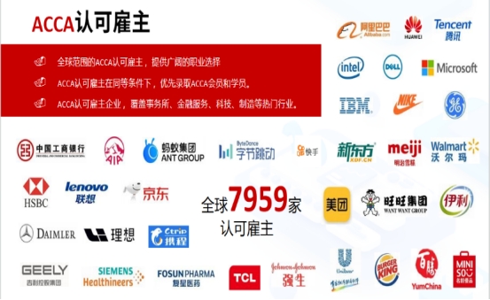 ACCA职业资格证书在全球范围内受到广泛认可:全球认可雇主7959家,国内认可雇主近800家,雇主覆盖金融服务、会计师事务所、通讯科技、生产制造等行业的世界500强企业。在同等条件下,雇主会优先录用ACCA学员或会员。