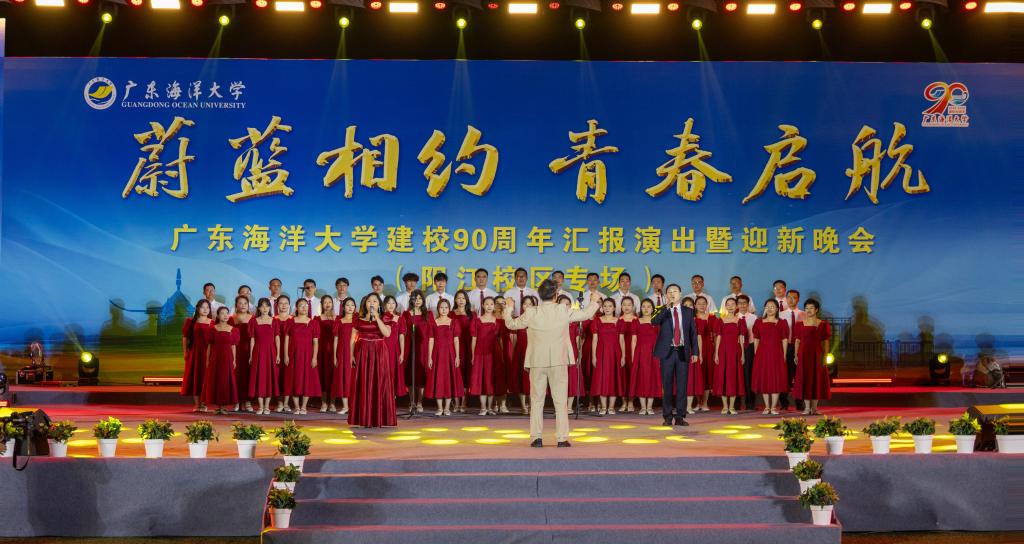 晚会以阳江校区师生合唱《国家》《蔚蓝之歌》拉开帷幕,围绕校庆与迎新主题展开三个篇章。第一篇章“蔚蓝印记・九秩芳华”通过话剧《南珠之光》呈现熊大仁教授践行“中国不成为珍珠王国,死不瞑目”誓言的传奇人生,让师生深切感悟老一辈海大人的家国担当,配合民族舞《石榴红了》与街舞《we young》,展现海大精神传承与青春朝气。第二篇章“青春逐浪・芳华绽放”以话剧《海上粮仓的守护者》讲述卢伙胜教授扎根南海坚守科研,助力“海上粮仓”落地的感人事迹,结合武术与笛乐《墨武丹青 笛绘春秋》、中国舞《石窟・日月》及荧光秀《光影绘蔚蓝》,彰显学子多元才艺。第三篇章“蔚蓝启航・逐梦新程”中,师生朗诵《又一片海洋》触摸校史中的蔚蓝印记,聆听新一代海大人的启航心声,街舞《Heated Waves》与歌曲串烧《我爱海大》点燃全场热情,表达对母校的深情祝福与新征程的向往。