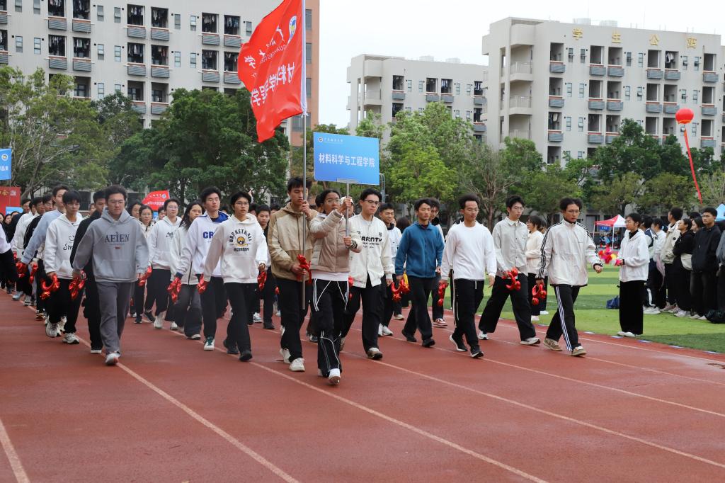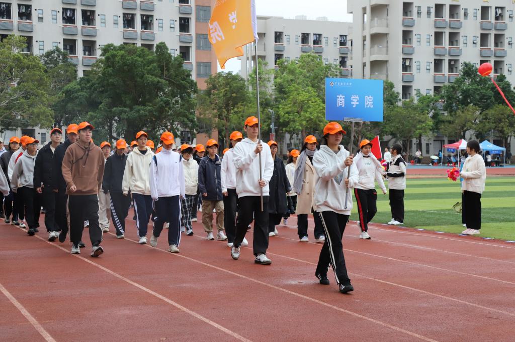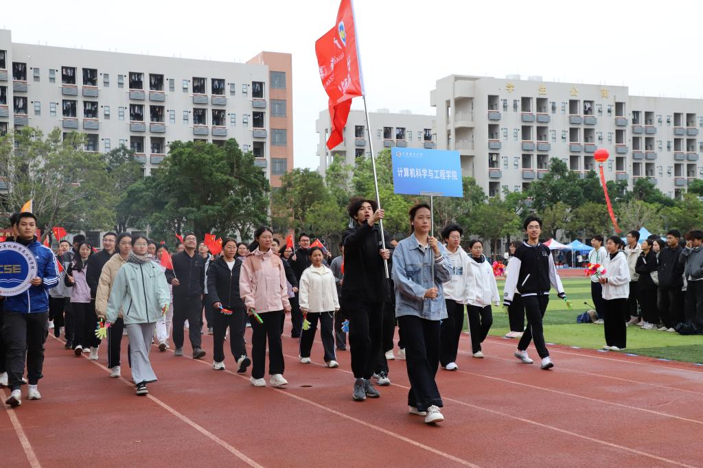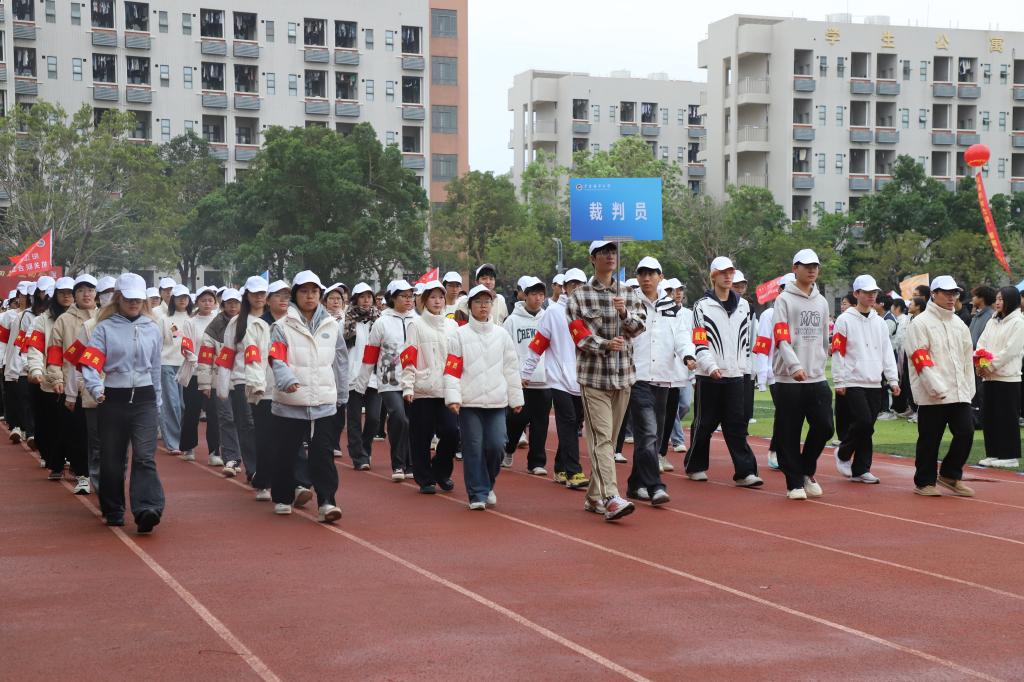 伴随着激昂的旋律,国旗队、校旗队、红旗队、裁判员方队以及机关联合工会方队、各学院方队依次入场。本届运动会共设20个学生组项目、11个教工组项目,5支学生代表队和7支教工代表队近400名运动员参赛。